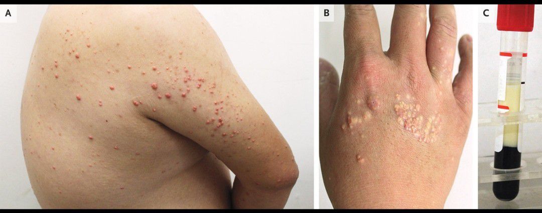 A 27-year-old man presented to the dermatology clinic with an asymptomatic rash on his back, arms, and hands that had developed 1 week earlier. He had a history of obesity and consumed a high-fat diet with frequent alcohol use. He had no known family history of dyslipidemia, vascular disease, or pancreatitis. On physical examination, scattered pink-yellow papules were present on the upper back, extensor surfaces of the upper arms (Panel A), and dorsa of the hands (Panel B). A fasting blood sample was grossly lipemic (Panel C). The triglyceride level was 10,650 mg per deciliter (120.2 mmol per liter; reference value, <151 mg per deciliter [<1.7 mmol per liter]), and the total cholesterol level was 1102 mg per deciliter (28.5 mmol per liter; reference value, <201 mg per deciliter [<5.2 mmol per liter]). A diagnosis of eruptive xanthomas due to severe hypertriglyceridemia was made. The differential diagnosis includes molluscum contagiosum, sebaceous hyperplasia, and generalized eruptive histiocytoma, but eruptive xanthomas should be suspected in patients with risk factors. The patient was referred to the internal medicine clinic for further evaluation and treatment. After 1 month of treatment with fenofibrate, along with alcohol cessation, exercise, and a low-fat diet, the skin lesions abated.