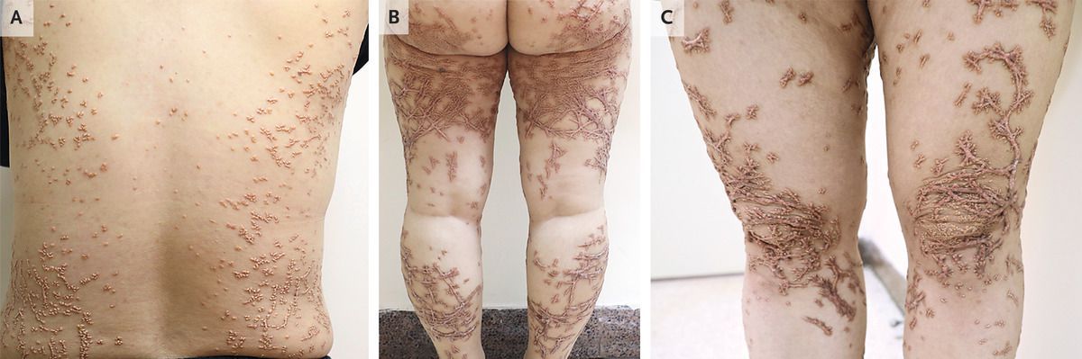 A 34-year-old woman with obesity presented to the endocrinology clinic with a 4-year history of progressively worsening skin lesions and a 3-month history of unintentional weight loss. Her body-mass index (the weight in kilograms divided by the square of the height in meters) was 30. Physical examination showed symmetric clusters of pink-yellow papules that merged into branching projections on the trunk, buttocks, and all four limbs. Laboratory studies showed a fasting triglyceride level of 6349 mg per deciliter (71.7 mmol per liter; reference value, <150 mg per deciliter [<1.7 mmol per liter]), a total cholesterol level of 760 mg per deciliter (19.7 mmol per liter; reference value, <200 mg per deciliter [<5.2 mmol per liter]), and a glycated hemoglobin level of 11.8% (reference range, 4.0 to 5.6). The thyrotropin level was normal. Biopsy of skin from the right calf revealed foamy macrophages, loose lipids, and fusiform fibroblast hyperplasia. A diagnosis of eruptive xanthomas due to severe hypertriglyceridemia in the context of untreated diabetes mellitus was made. Eruptive xanthomas are a sign of severe hypertriglyceridemia, a condition in which prompt intervention may prevent complications such as pancreatitis. A treatment regimen of a low-fat diet, fenofibrate, insulin, and oral diabetes agents was initiated. At follow-up 6 months after presentation, the eruptive xanthomas had resolved, but hyperpigmentation remained over the branching projections.