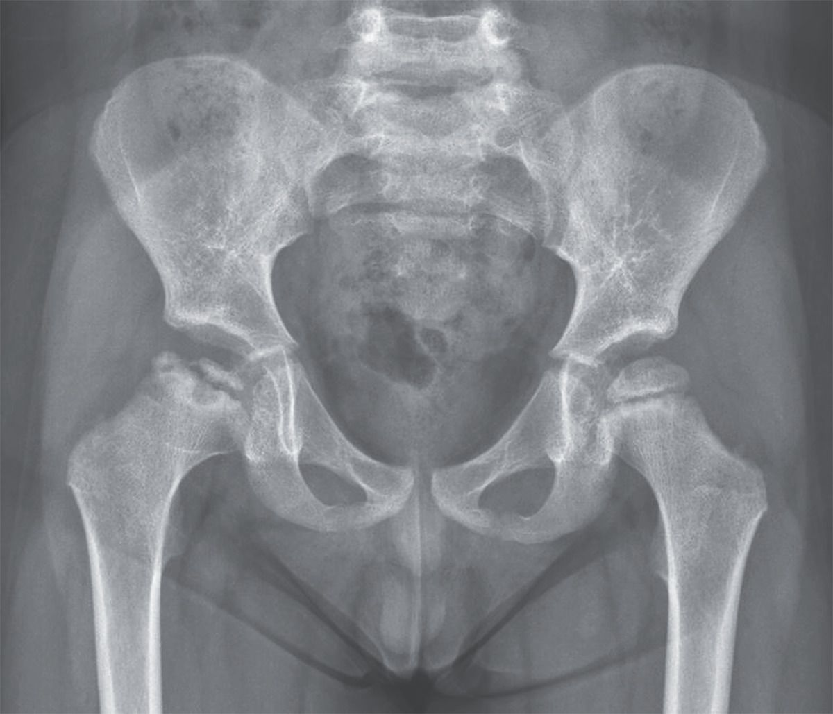 A 4-year-old boy was brought to the orthopedic clinic with a 2-day history of pain in the right hip and limping. There had been no preceding trauma or fever. Physical examination showed no limitation in hip range of motion on either side. There was an antalgic gait favoring the right side but no discrepancy in leg length and no soft-tissue changes or neurologic abnormalities. A radiograph of the pelvis showed a focal area of collapse in the right femoral head. A diagnosis of Legg–Calvé–Perthes disease was made. Legg–Calvé–Perthes disease is an idiopathic avascular necrosis of the femoral head in preadolescent children. It manifests as acute- or insidious-onset hip pain or limping, and the differential diagnosis includes infection, trauma, and synovitis. Early in the course of the disease, plain radiographs may appear normal. Treatment with short-term bracing was initiated to maintain hip abduction within a range of approximately 30 degrees to contain the femoral head within the acetabulum. The patient was also advised to avoid high-impact physical activity and was reassured with regard to an expected favorable prognosis. At the 2-month follow-up visit, the patient’s pain and limping had resolved.