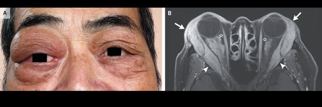 A 67-year-old man presented to the ophthalmology clinic with a 1-year history of swelling in both eyes and protrusion of the right eye (Panel A) and a 2-week history of blurry vision. Extraocular movements were limited, and visual acuity was reduced in both eyes. There was no swelling in the parotid or submandibular glands. The results of laboratory tests were notable for a serum IgG4 level of 1440 mg per deciliter (reference range, 3 to 201) and an absolute eosinophil count of 769 cells per cubic millimeter (reference range, 10–24). Magnetic resonance imaging of the orbits showed swelling of the lacrimal glands (Panel B, arrows) and the lateral rectus muscles (arrowheads) on both sides. There were also mass lesions surrounding the optic nerves (Panel B, asterisks). A biopsy specimen of the right lacrimal gland showed a lymphoplasmacytic infiltrate, with IgG4-positive plasma cells. Neither storiform fibrosis nor obliterative phlebitis was present. A diagnosis of IgG4-related dacryoadenitis, orbital myositis, and optic-nerve disease was made. Computed tomography of the whole body did not reveal other sites of involvement. Treatment was initiated with 30 mg of prednisone daily, which was subsequently tapered. At a 3-month follow-up visit, the patient’s symptoms had abated.