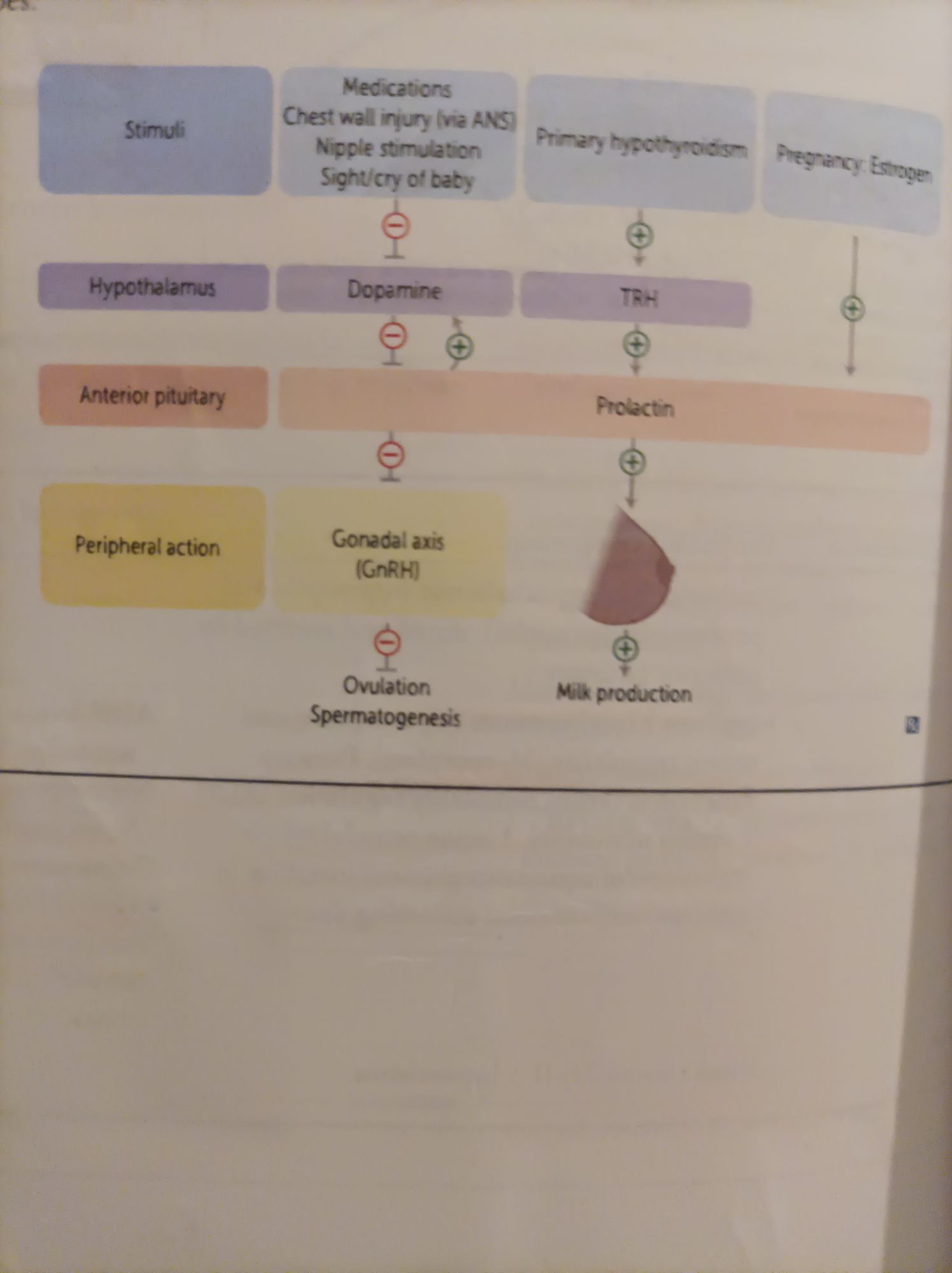 Secreted mainly by anterior pituitary Stimulates the milk production in breast and inhibits the ovulation in females and spermatogenesis in male by inhibiting GnRH synthesis and release. Prolactin secretion is regulated by dopamine from tuberoinfundibular pathway of the hypothalamus. Prolactin inhibits its own secretion by increasing dopamine synthesis and secretion from hypothalamus