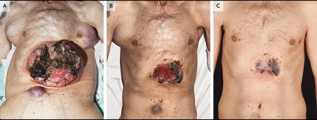 A 51-year-old man presented to the dermatology clinic with an approximately 36-month history of growth of multiple skin tumors and a 6-month history of weight loss and abdominal pain. On physical examination, the patient was cachectic. There were large masses in the axillae and inguinal regions and on the abdominal wall (Panel A). Computed tomography (CT) of the whole body and magnetic resonance imaging of the head revealed metastases throughout the body. Biopsy of a chest-wall mass revealed metastatic melanoma. Treatment with one cycle of ipilimumab and nivolumab was initiated. After mutational analysis of the mass revealed a BRAF V600E mutation, the treatment was changed to dabrafenib (a BRAF inhibitor) and trametinib (a MEK inhibitor). Within 2 weeks after initiation of the targeted therapy, the masses started to decrease in size (Panel B). After 6 weeks of targeted therapy, a whole-body CT scan showed regression of all the metastases except for a nonresponsive metastasis in the right axilla that was surgically removed. After 12 weeks of targeted therapy, the masses had become even smaller (Panel C). In patients with melanoma, immunotherapy and targeted therapy can lead to a rapid and clinically significant tumor response. Fifteen months after the patient’s initial presentation, he was transitioned to hospice care owing to progression of disease.