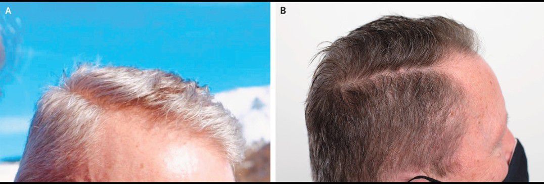 A 51-year-old man with chronic myeloid leukemia visited the oncology clinic for routine follow-up. Treatment with nilotinib, a tyrosine kinase inhibitor, had been initiated 18 months earlier. During that time, the patient had noticed, much to his delight, the gradual repigmentation of his gray hair (Panel A, photo obtained approximately 1 year before the initiation of nilotinib) to its original color. During the same period, he had not started any other new medications and had used no hair-coloring products. On physical examination, his previously gray hair was noted to have become brown (Panel B). No other changes in his hair, skin, or mucosal pigmentation were observed. Molecular testing showed a deep molecular response. A diagnosis of medication-induced hair repigmentation due to the use of a tyrosine kinase inhibitor was made. Given the response of the leukemia to treatment with nilotinib, it was continued, and the patient’s hair remained brown.