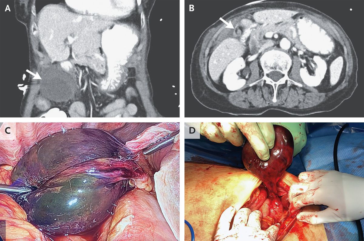 An 86-year-old woman presented to the emergency department with a 1-day history of nausea, vomiting, and pain on the right side of her abdomen. Her vital signs were normal. On physical examination, there was tenderness in the right upper quadrant, with a positive Murphy’s sign and involuntary guarding. The results of laboratory studies were normal. Computed tomography of the abdomen and pelvis revealed a distended gallbladder with a thickened wall outside the gallbladder fossa (Panel A, arrow). There was also swirling of the cystic artery and duct (Panel B, arrow) but no dilatation of the common bile duct. Gallbladder volvulus was suspected, and the patient was taken to the operating room. The diagnosis was confirmed on laparoscopy when a free-floating, necrotic gallbladder was observed encircling the cystic artery and duct (Panel C). The surgery was converted to an open procedure, and detorsion and resection of the gallbladder were successfully performed (Panel D). Gallbladder volvulus occurs when the gallbladder twists along the axis of the cystic artery and duct, compromising blood flow to the organ. Patients present with an acute abdomen, and the cause may be difficult to diagnose preoperatively. This patient did well after surgery and was discharged on postoperative day 2.