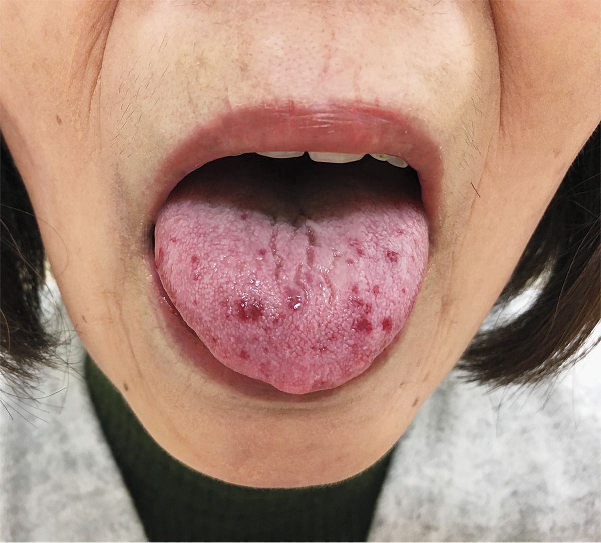 A 61-year-old woman with primary biliary cholangitis and a 1-year history of Raynaud’s phenomenon was referred to the rheumatology clinic for further evaluation and treatment. She reported a long-standing history of swollen fingers but no finger ulcerations, joint pain or swelling, dyspnea on exertion, dysphagia, or heartburn. On physical examination, telangiectasias were seen on the palms and the volar aspect of the fingers and on the tongue. There was no tightening of the perioral skin. The fingers were puffy and without sclerodactyly. Punctate hemorrhages of the nailfold capillaries were also noted, and a subsequent nailfold capillaroscopy confirmed capillary enlargement with pericapillary hemorrhage. The patient tested positive for anticentromere antibodies and negative for autoantibodies against topoisomerase I. A diagnosis of limited cutaneous systemic sclerosis was made. In systemic sclerosis, telangiectasias may be seen on the oral mucosa, as well as on the hands, face, and upper torso. Given this, an oral examination is an important part of the assessment. On further evaluation of this patient, no pulmonary hypertension or interstitial lung disease was noted. Treatment for symptoms of Raynaud’s phenomenon was initiated. At a 3-year follow-up, the symptoms of Raynaud’s phenomenon had abated but the patient’s telangiectasias remained.