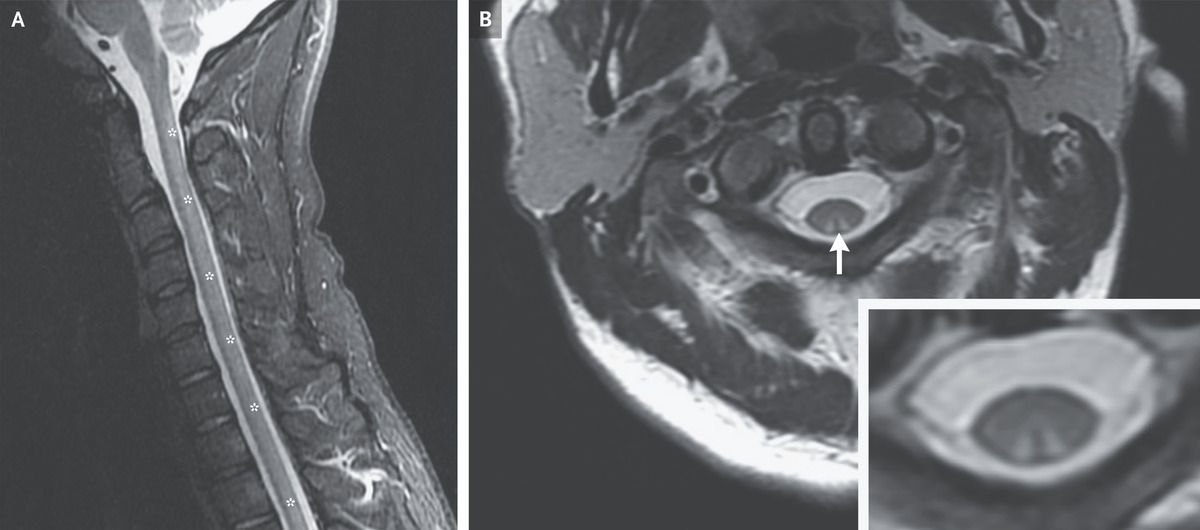 A 32-year-old man presented to the emergency department with a 6-week history of tingling in his arms and legs and a 2-week history of inability to walk. Two months before presentation, he had begun inhaling nitrous oxide — also known as “whippets” or “laughing gas” — daily. On physical examination, the Romberg test was positive, and sensory ataxia, impaired proprioception and vibratory sensation, and preserved nociception were noted. Magnetic resonance imaging of the whole spine showed hyperintensity in the posterior spinal cord from C1 to T12 on T2-weighted images (Panel A, asterisks). Axial images revealed a lesion in the dorsal column that was hyperintense on both T2-weighted images and fluid-attenuated inversion recovery (FLAIR) sequence, a finding known as the “inverted-V sign” that is seen in subacute combined degeneration (Panel B, arrow and inset). The patient’s vitamin B12 level was 107 pg per milliliter (reference value, >231). There was no macrocytic anemia. Antibody testing for autoimmune gastritis was negative. A diagnosis of subacute combined degeneration associated with nitrous oxide use was made. Long-term use of nitrous oxide causes the inactivation of vitamin B12, which then interrupts methionine synthase activity. After the patient ceased nitrous oxide use and received treatment with cyanocobalamin injections for 2 weeks, his vitamin B12 level normalized. At the 4-week follow-up, he was able to walk independently.