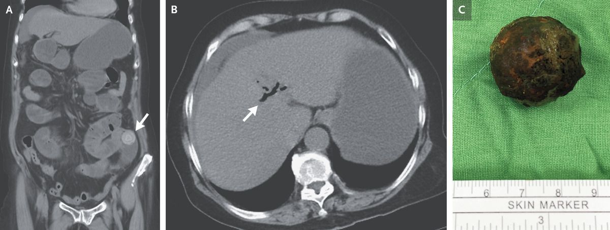 A 74-year-old woman with hypertension presented to the emergency department with a 3-day history of epigastric pain, nausea, vomiting, fever, chills, weakness, and poor appetite. She also reported having had no bowel movements or flatus for the past 2 days. Her blood pressure was 150/128 mm Hg, and her heart rate 144 beats per minute. An abdominal examination revealed tenderness in the periumbilical region and in the left lower quadrant, with voluntary guarding and rebound tenderness. There was no jaundice. Computed tomography of the abdomen revealed obstruction of the ileum caused by a gallstone (Panel A, arrow) and pneumobilia (Panel B, arrow). This combination of radiologic findings — an ectopic gallstone, small-bowel obstruction, and pneumobilia — is known as Rigler’s triad and aroused concern about gallstone ileus. Gallstone ileus is an uncommon cause of small-bowel obstruction, wherein a gallstone passes through a biliary–enteric fistula and becomes impacted within the intestinal lumen. The patient underwent a laparotomy, which confirmed gallstone ileus, and an enterotomy was performed to remove the gallstone (Panel C). Broad-spectrum antibacterial agents were administered after the procedure. The patient was discharged home on postoperative day 11 and was referred for an outpatient cholecystectomy.