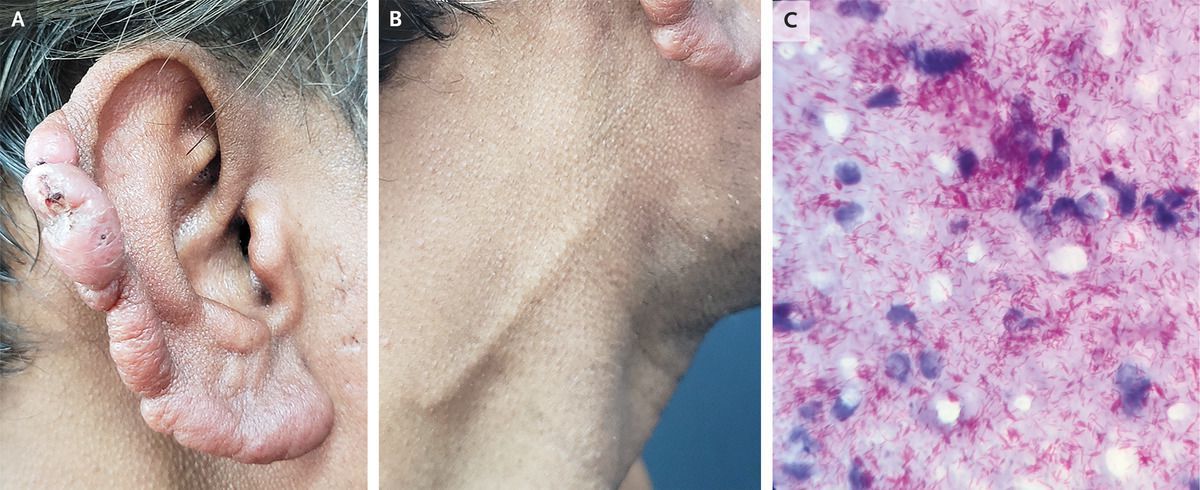 A 40-year-old man presented to the dermatology clinic with a 1-year history of painless swelling of his earlobes. He also reported having nasal congestion and intermittent nosebleeds. On examination, painless, indurated, contiguous nodules along the helixes of both ears were observed (Panel A). Thickening of the greater auricular nerve (Panel B) on both sides and patchy loss of sensation in the distal arms and legs were also present. Dermal fluid was obtained from an incision in the earlobe for a skin smear, which was stained with the use of the modified Ziehl–Neelsen method and examined under an oil-immersion lens. The skin smear showed innumerable acid-fast bacilli (Panel C). A diagnosis of lepromatous leprosy was made. Leprosy, also known as Hansen’s disease, is a chronic infection involving the skin and nerves that is caused by Mycobacterium leprae complex. Lepromatous leprosy, the most severe form, is characterized by a weak immune response and high burden of organisms. Patients with lepromatous leprosy often present with diffuse skin involvement and even infiltration of the nasal mucosa, as was observed in this patient. A 12-month course of uniform multidrug therapy was prescribed, but the patient was lost to follow-up after 2 months.