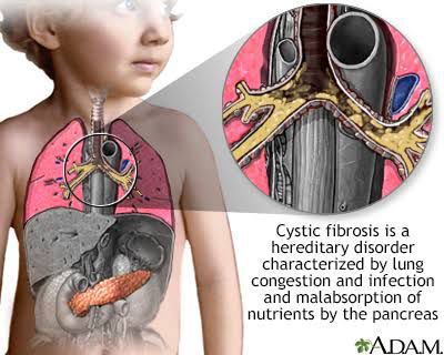 Cystic Fibrosis is an inherited autosomal recessive disease of adults and children. In which there is mutation of CFTR gene on chromosome 7 which results in thick viscous secretion, impaired mucus clearance in the lung, impaired pancreatic secretion and abnormal sweat. Clinical features include respiratory symptoms ( productive cough, chronic bronchitis and bronchiectasis, digital clubbing) , intestinal symptoms (meconium ileus), pancreatic insufficiency ( DM, fat soluble vitamins deficiency, steatorrhea). Diagnostic test include sweat test, CXR, DNA testing and nasal potential difference. Management promotes clearance of airway secretion, antibiotics, pancreatic enzymes replacement and fat soluble vitamins replacement.
