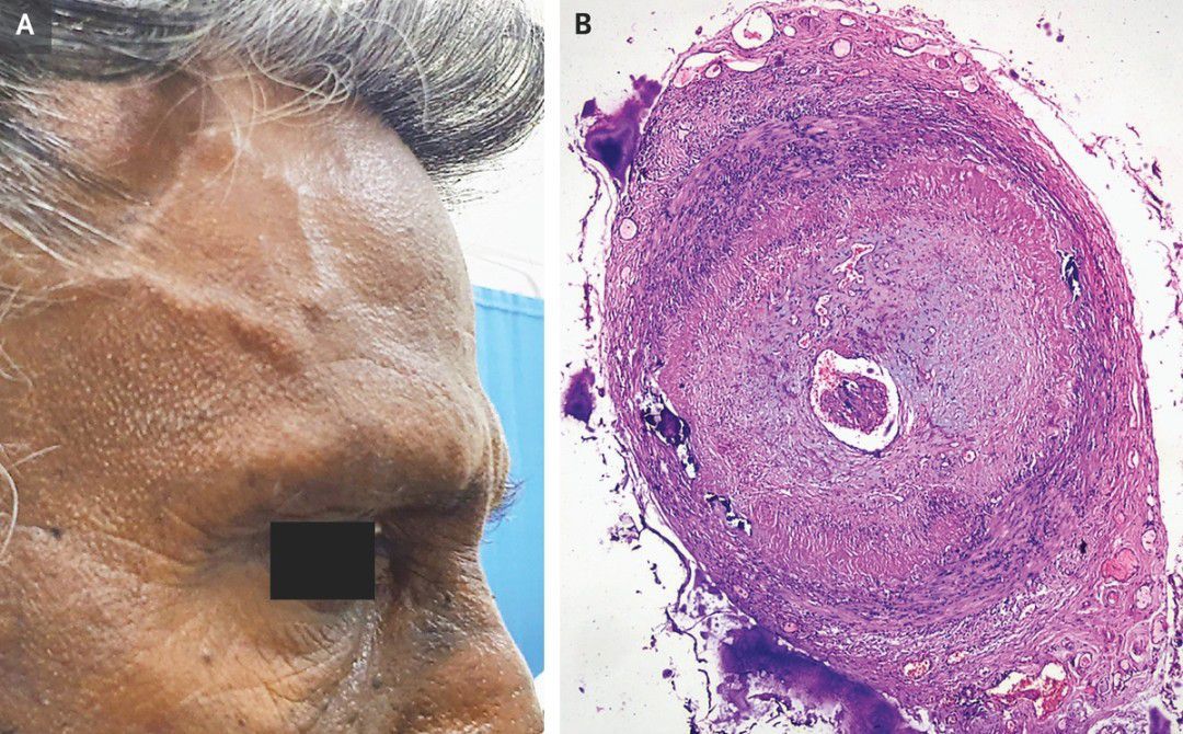 A 70-year-old man presented to the neurology clinic with a 3-week history of temporal headache and jaw pain with chewing. He reported no vision changes. On physical examination, both temporal arteries were thickened, with more pronounced thickening on the right side than on the left side (Panel A). The arteries were also tender on palpation, with diminished pulses. The ophthalmic examination was normal. Laboratory studies showed an erythrocyte sedimentation rate (ESR) of 15 mm per hour (reference value, <14) and a C-reactive protein (CRP) level of 24 mg per liter (reference value, <10). Doppler ultrasonography of both temporal arteries revealed diffuse wall thickening with a “halo sign” — a hypoechoic area around the vessel lumen. Owing to concern about giant-cell arteritis, treatment with high-dose oral prednisolone was started. Biopsy of the right temporal artery revealed transmural thickening of the arterial wall with a lymphohistiocytic infiltrate and multinucleate giant cells (Panel B), which confirmed the diagnosis. In some cases of giant-cell arteritis, the ESR may not be markedly elevated, although it is uncommon for both the ESR and the CRP level to be normal. At the 1-week follow-up visit, the patient’s symptoms had abated, and a gradual tapering of the glucocorticoid dose was started at the 4-week follow-up visit.