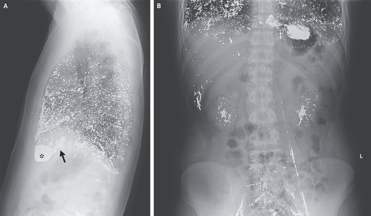 A previously healthy 25-year-old man presented to the general medicine clinic with a 3-month history of worsening fatigue, nausea, and dry cough. One week before the onset of his symptoms, he had injected 4 ml of elemental mercury intravenously as a folk remedy for tinea cruris. Conjunctival pallor was observed on physical examination. Laboratory studies showed a hemoglobin level of 6.5 g per deciliter (reference range, 12.0 to 16.0), a serum mercury level of 430 μg per deciliter (21,440 nmol per liter; reference value, <1.5 μg per deciliter [70 nmol per liter]), a 24-hour urine mercury level of 29,792 μg (148,510 nmol; reference value, <45 μg [220 nmol]), and normal renal function. A chest radiograph (Panel A) showed diffusely distributed metallic opacities in the lungs, right atrium (arrow), and right ventricle (asterisk). An abdominal radiograph (Panel B) showed similar metallic densities in the liver, kidneys, iliac veins, and left gonadal vein. A diagnosis of mercury poisoning was made. Inpatient chelation therapy with intravenous unithiol was initiated. After 2 weeks of treatment, the patient’s symptoms had abated, his hemoglobin level had increased to 8.0 g per deciliter, and his serum mercury level had decreased to 254 μg per deciliter (12,660 nmol per liter). The patient was discharged from the hospital with a recommendation to continue chelation therapy with oral dimercaptosuccinic acid.