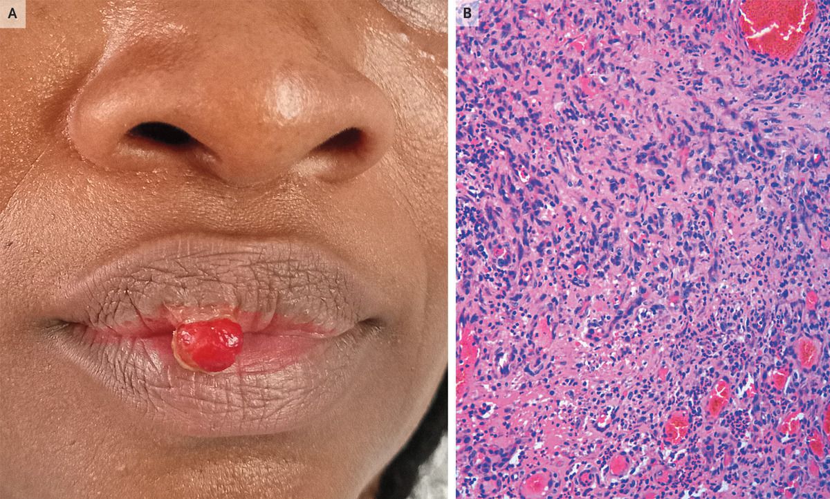 A 45-year-old woman with type 2 diabetes presented to the plastic surgery clinic with a 6-week history of a painless upper-lip lesion. The lesion had rapidly increased in size over the previous 3 weeks and bled when lightly touched. The patient was not pregnant. On physical examination, the lesion was found to be an erythematous, round, smooth, pedunculated mass (Panel A). It was friable but not tender to touch. Histopathological examination of an excisional biopsy specimen showed proliferating vessels, fibroblasts, numerous inflammatory cells, and surface ulceration, findings consistent with pyogenic granuloma (Panel B). Pyogenic granulomas — also known as lobular capillary hemangiomas — are benign, rapidly growing vascular tumors that may occur at sites of frequent trauma, such as the lips, gingiva, and fingers. Contrary to what the name suggests, neither pus nor granulomatous tissue is associated with these lesions. Bleeding is common and is often the presenting symptom. The lesions are typically excised to address the bleeding, ulceration, or cosmetic appearance. At a 4-month follow-up visit, the lesion had not recurred.