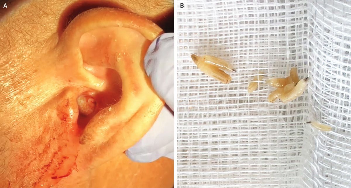 A 64-year-old man from a rural community presented to the emergency department with a 5-day history of pain, itching, and bleeding in the left ear. On physical examination, numerous mobile larvae were found to be occluding the left external auditory canal (Panel A and Video 1), a finding indicative of aural myiasis. An ear aspirator, forceps, and irrigation with sterile water were used to remove the larvae (Panel B and Video 2). Perforation of the tympanic membrane was identified on further examination of the left ear. Aural myiasis is an infestation of the middle or external ear by fly larvae of the order Diptera. Risk factors include chronic otitis media, diabetes mellitus, and impaired hygiene. Treatment involves removal of the larvae and irrigation of the ear to expel any remaining organisms. The patient was treated with topical and systemic antibacterial agents to prevent secondary infection and was referred to the otolaryngology department for possible tympanoplasty. Seven days later, the symptoms had resolved.