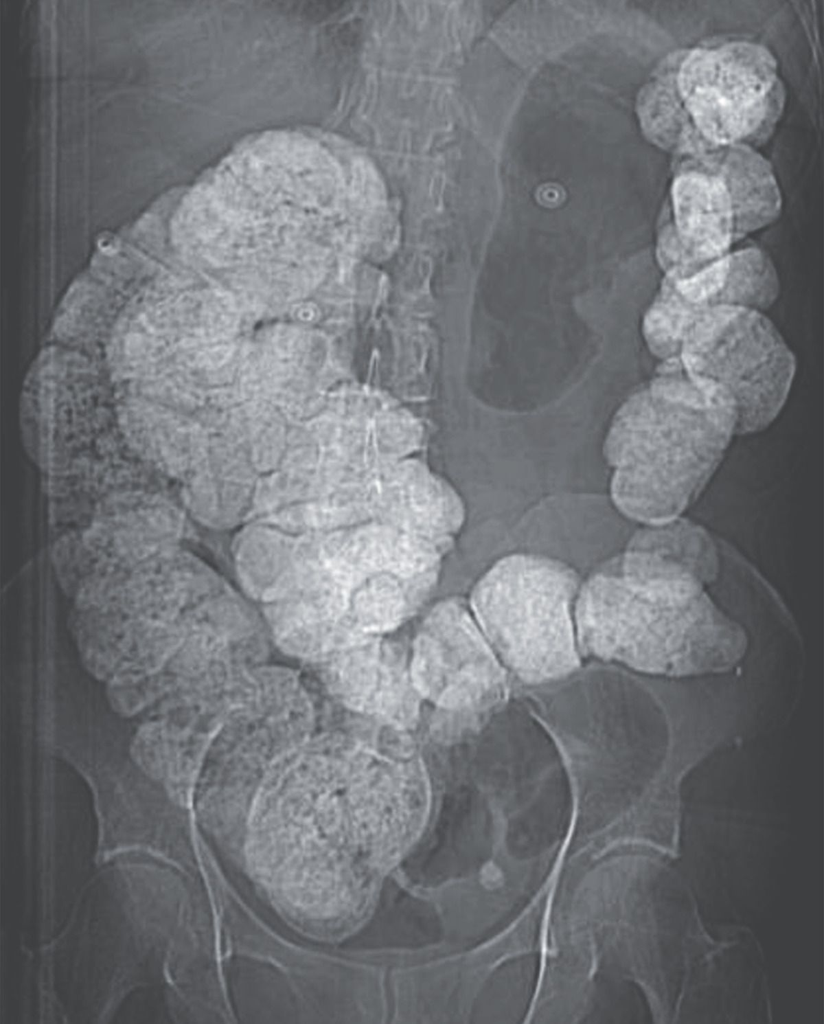 A 70-year-old woman with depression and irritable bowel syndrome presented to the emergency department with a 3-day history of altered mental status, shortness of breath, nausea, and vomiting. She had recently increased her daily intake of liquid bismuth subsalicylate, which she had been using for irritable bowel symptoms, to treat worsening diarrhea and abdominal pain. Physical examination was notable for a respiratory rate of 22 breaths per minute, confusion, and mild, diffuse abdominal pain. Laboratory testing showed primary anion-gap metabolic acidosis, primary respiratory alkalosis, and a salicylate level of 76 mg per deciliter (5.50 mmol per liter; normal value, <5 mg per deciliter [0.35 mmol per liter]). An abdominal radiograph, for which no oral contrast material had been administered, showed intraluminal radiopaque material throughout the bowel. A diagnosis of bismuth subsalicylate poisoning was made. Bismuth subsalicylate is metabolized to bismuth and salicylic acid in the gastrointestinal tract. Large quantities of bismuth appear radiopaque owing to the high density of the substance, which approaches that of lead. After treatment with sodium bicarbonate infusion and hemodialysis for salicylate poisoning, the patient’s symptoms abated; a repeat salicylate level was 0.