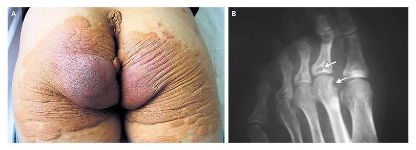 An 18-year-old woman with familial hypercholesterolemia presented with a 4-year history of swelling and pain in the joints. She was born with multiple xanthomas, which grew in size as she aged. Her elder brother had had more severe xanthomatosis and had died of myocardial infarction at 30 years of age. Physical examination revealed diffuse, flat xanthomas on her elbows, knees, and buttocks and large tuberous xanthomas on her buttocks (Panel A). The joints of her hands and feet were enlarged. Laboratory tests revealed the following lipid concentrations: total cholesterol, 669 mg per deciliter (17.3 mmol per liter) (normal range, 120 to 220 [3.1 to 5.7]), and low-density lipoprotein (LDL) cholesterol, 338 mg per deciliter (8.7 mmol per liter) (normal range, 0 to 131 [0.0 to 3.4]); the total triglyceride and high-density lipoprotein cholesterol levels were within the normal ranges. Radiography showed cystic and erosive lesions of the left metatarsophalangeal joints (Panel B, arrows). Evaluation did not reveal typical causes of the arthropathy, such as infection. The patient was treated with simvastatin and acetaminophen. One month later, the arthritis had improved, the total and LDL cholesterol levels had decreased to 333 and 258 mg per deciliter (8.6 and 6.7 mmol per liter), respectively, and the xanthomas were unchanged. These findings are consistent with a rare erosive arthropathy from hyperlipidemia. Sheng Guang Li, M.D. Chinese People's Liberation Army General Hospital, Beijing 100853, China source: nejm.org