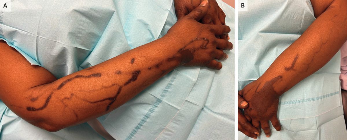 A 58-year-old woman with a history of metastatic uterine leiomyosarcoma presented to the dermatology clinic with a 1-month history of a nonpruritic rash on her arms. Six weeks before presentation, she had started palliative chemotherapy with gemcitabine and docetaxel, which had been administered through peripheral intravenous catheters. On examination, hyperpigmented plaques were observed on the dorsa of both hands at the sites of previous intravenous access. The darkened skin extended up the arms in a linear pattern along the network of superficial veins (Panels A and B). The skin lesions were slightly palpable but were not tender. A diagnosis of docetaxel-associated serpentine supravenous hyperpigmentation was made. Serpentine supravenous hyperpigmentation is a cutaneous side effect of several intravenous chemotherapy agents, including docetaxel, vinorelbine, and — most commonly — fluorouracil. The mechanism of skin hyperpigmentation remains unclear, but the reaction is benign; the underlying veins remain patent. The reaction can be avoided with the use of a central venous catheter for drug infusion. In this patient, a central venous catheter was placed for subsequent administration of chemotherapy. At a follow-up visit 2 months later, the rash had abated.
