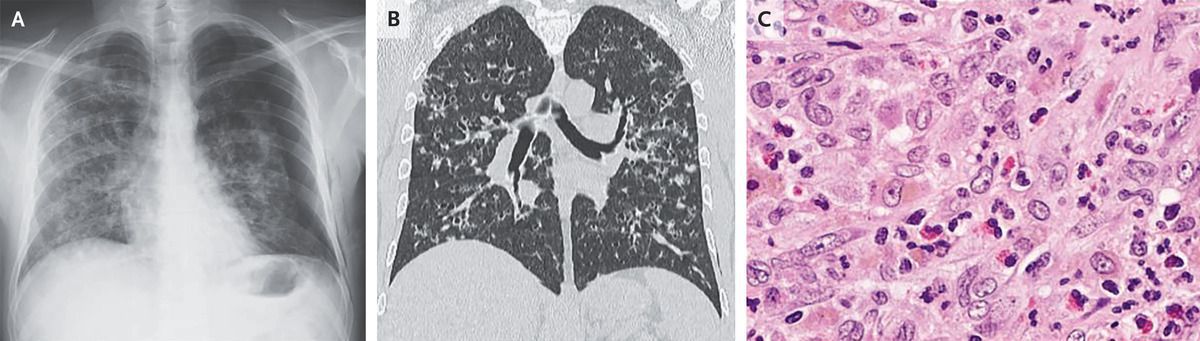 A 40-year-old man with a history of smoking presented to the emergency department with a 2-week history of cough, dyspnea, night sweats, and pleuritic chest pain on the left side. Physical examination was notable for decreased breath sounds over the left lung fields. A chest radiograph showed a large pneumothorax on the left side and interstitial infiltrates in both lungs (Panel A). The pneumothorax was treated with chest-tube thoracostomy. Subsequent computed tomography of the chest showed multiple cysts and nodules, predominantly in the upper and middle lung fields, with sparing of the costophrenic angles (Panel B). A transbronchial lung biopsy was performed. Histopathological tests showed a lymphocytic lung infiltrate with interalveolar septal thickening, eosinophils, and large cells with foamy cytoplasm and large nuclei (Panel C). Immunohistochemical staining was positive for S-100 protein, CD1a, placental acid phosphatase, and langerin. A diagnosis of pulmonary Langerhans-cell histiocytosis was made. Further testing revealed no evidence of systemic histiocytosis. BRAF testing was not done. The patient was advised to stop smoking, and a tapering dose of prednisone was prescribed. At the 6-month follow-up, the patient had ceased smoking; he was still taking low-dose prednisone, and his symptoms had abated.