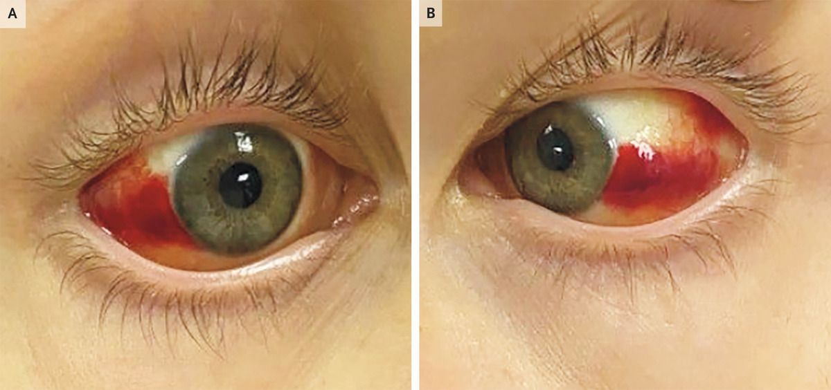 A previously healthy 18-year-old man presented to the emergency department with a 2-day history of fever, vomiting, and diarrhea. Three weeks before presentation, he had fallen into a canal. His heart rate was 110 beats per minute, and the temperature was 38.4°C. The physical examination was notable for scleral icterus and subconjunctival hemorrhage in both eyes (Panels A and B) as well as mild abdominal tenderness without hepatosplenomegaly. Laboratory studies showed acute kidney injury and elevations in aminotransferase and total bilirubin levels. A severe form of leptospirosis that manifests as fever, jaundice, renal failure, and hemorrhage was suspected on the basis of the patient’s classic presentation (including the subconjunctival bleeding) and exposure to water with probable contamination by rodent urine. Empirical treatment with intravenous penicillin was initiated. Analysis for IgM antibodies against leptospira species revealed a titer of 1:320 (reference value, negative). Serum nucleic acid amplification testing was positive for leptospira species, and microscopic agglutination testing later identified Icterohaemorrhagiae as the infecting serogroup. The patient was discharged after a 1-week hospital stay. At follow-up 3 weeks later, his symptoms, subconjunctival hemorrhage, and liver and kidney injury had resolved.