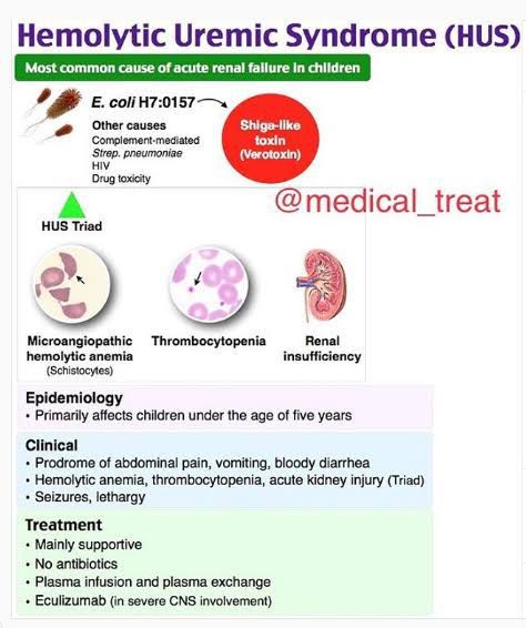 HUS is caused by Shiga toxin-producing E.coli infection (serotype O157:H7) which causes profound endothelial dysfunction. Present with fever, bloody diarrhea, acute kidney injury, thrombocytopenia and microangiopathic hemolytic anemia. Common in children. Treatment is supportive care