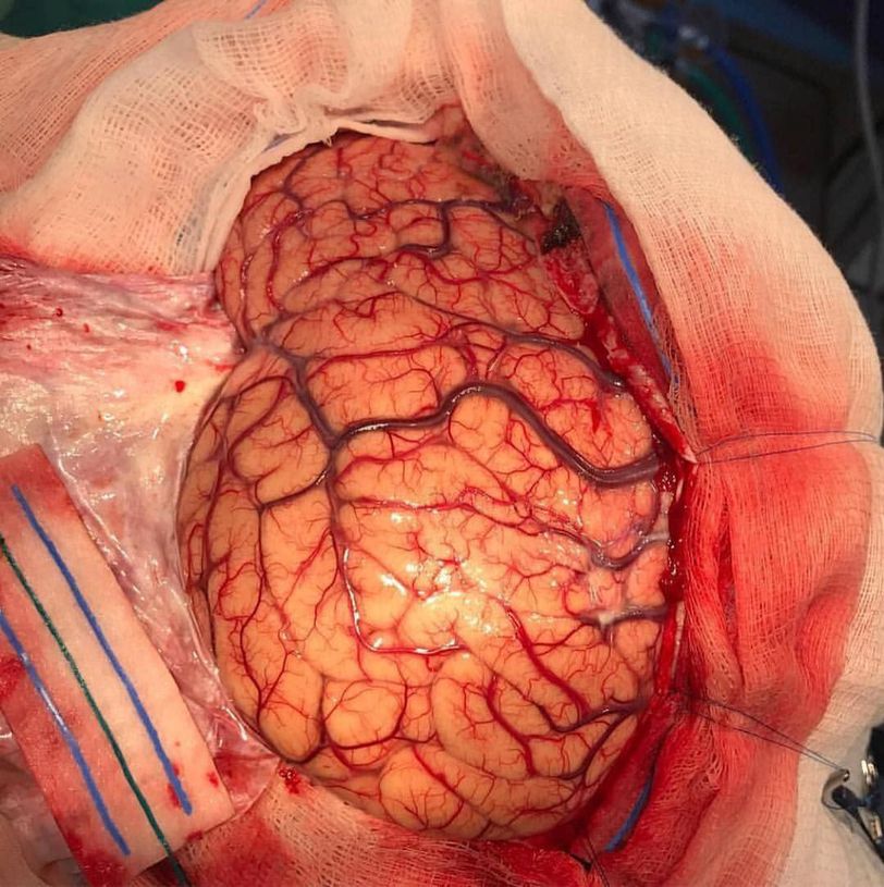 This intraoperative photograph of the brain demonstrates the meaning of both uniqueness and precision. Brain surgery is a fairly aggressive process. There's a lot to get through. There's the beautiful, delicate shaving first, which is really lovely. There's a wonderful ceremony of putting all the covers on, so only the little bit you're operating on is revealed. But once they make the incision and tear the skin back, the drill comes out and the brain peeks from beneath. This is where all the magic happens.