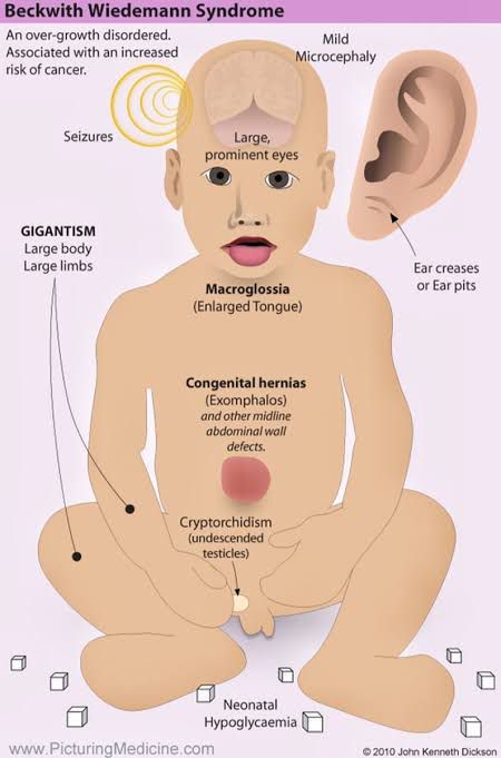 Beckwith-Wiedemann syndrome is a condition that affects many parts of the body. It is classified as an overgrowth syndrome, which means that affected infants are larger than normal (macrosomia), and some may be taller than their peers during childhood. Growth begins to slow by about age 8, and adults with this condition are not unusually tall. In some children with Beckwith-Wiedemann syndrome, specific body parts may grow abnormally large on one side of the body, leading to an asymmetric or uneven appearance. This unusual growth pattern, which is known as hemihyperplasia, usually becomes less apparent over time. The signs and symptoms of Beckwith-Wiedemann syndrome vary among affected individuals. Some children with this condition are born with an opening in the wall of the abdomen (an omphalocele) that allows the abdominal organs to protrude through the belly-button. Other abdominal wall defects, such as a soft out-pouching around the belly-button (an umbilical hernia), are also common. Some infants with Beckwith-Wiedemann syndrome have an abnormally large tongue (macroglossia), which may interfere with breathing, swallowing, and speaking. Other major features of this condition include abnormally large abdominal organs (visceromegaly), creases or pits in the skin near the ears, low blood glucose (hypoglycemia) in infancy, and kidney abnormalities. Children with Beckwith-Wiedemann syndrome are at an increased risk of developing several types of cancerous and noncancerous tumors, particularly a form of kidney cancer called Wilms tumor and a form of liver cancer called hepatoblastoma. Tumors develop in about 10 percent of people with this condition and almost always appear in childhood. Most children and adults with Beckwith-Wiedemann syndrome do not have serious medical problems associated with the condition. Their life expectancy is usually normal.