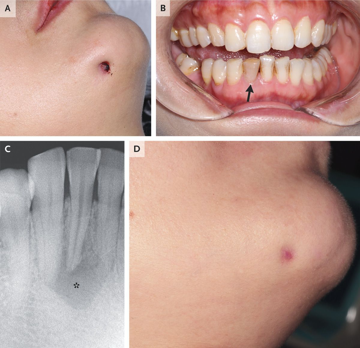 A previously healthy 42-year-old woman presented to the dental clinic with a 6-month history of swelling and pain on the right side of her chin. She reported no history of chin trauma, tooth pain, or fevers but did recall injuring her right lateral incisor while playing basketball approximately 10 years before presentation. On physical examination, there was an area of skin dimpling with overlying scabbing on the right lower portion of the chin (Panel A). Palpation of the lesion caused pain and drainage of serosanguinous fluid. Intraoral examination was notable for slight discoloration of the mandibular right lateral incisor (Panel B, arrow). A radiograph of the teeth showed periapical rarefaction and osteolysis around that tooth (Panel C, asterisk). A diagnosis of odontogenic cutaneous fistula was made. Odontogenic cutaneous fistula is caused by chronic infection of the tooth root due to dental caries, periodontal disease, or tooth fracture, as was likely to have occurred in this case. The condition manifests as dimpling, a nodule, or a cyst on the chin, jaw, or elsewhere on the face. Misdiagnosis may occur because of the variable appearance and possible lack of dental symptoms. In this case, a root canal was performed, and at the 4-month follow-up, the fistula had healed (Panel D).