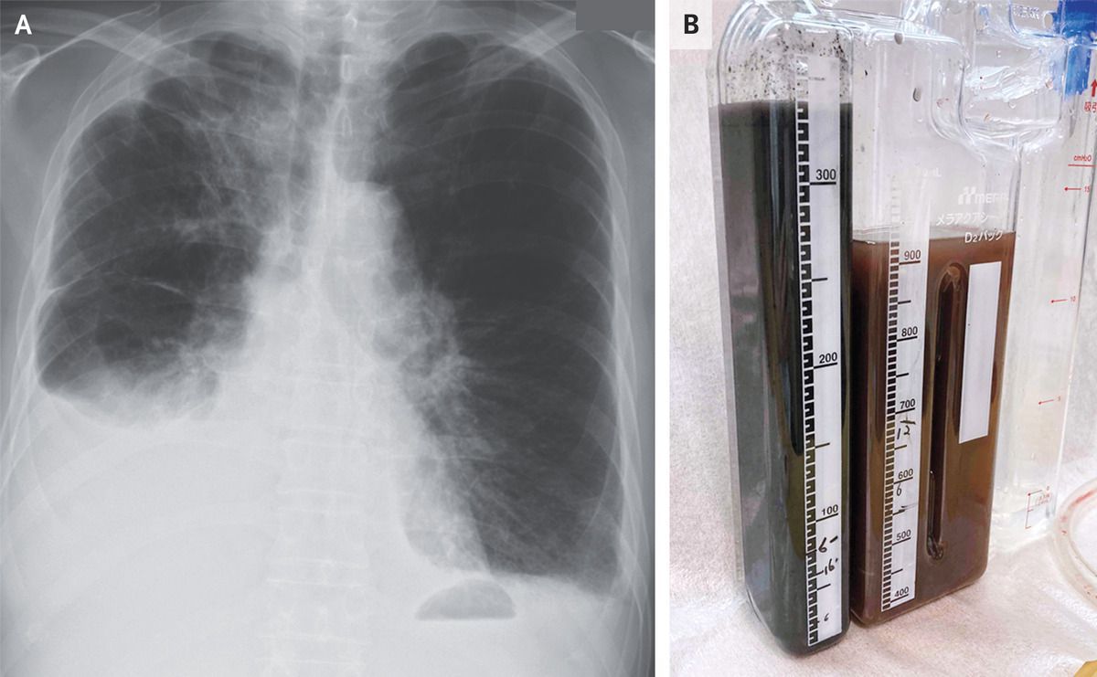 A 77-year-old man with metastatic lung adenocarcinoma presented to the emergency department with a 2-week history of dyspnea. Examination was notable for reduced breath sounds at the right lung base. A chest radiograph showed a pleural effusion on the right side (Panel A). An abdominal ultrasound image showed previously known liver metastases and perihepatic fluid, as well as new intrahepatic dilatation of the biliary ducts. Laboratory studies showed a serum total bilirubin level of 2.5 mg per deciliter (42.8 μmol per liter) (reference range, 0.3 to 1.2 mg per deciliter [5.1 to 20.5 μmol per liter]) and a direct bilirubin level of 2.0 mg per deciliter (34.2 μmol per liter) (reference range, 0.03 to 0.4 mg per deciliter [0.5 to 6.8 μmol per liter]). A chest tube was placed, and the color of the drained pleural fluid was olive brown that gradually changed to black (Panel B). Pleural-fluid studies showed an exudate with a total bilirubin level of 8.2 mg per deciliter (140.2 μmol per liter; reference value, 0) and a direct bilirubin level of 7.5 mg per deciliter (128.2 μmol per liter; reference value, 0). The pleural-fluid triglyceride level was normal, and cultures and cytologic studies were negative. A diagnosis of bilothorax was made. Bilothorax occurs when bile flows into the pleural space. In this case, the mechanism was thought to be diaphragmatic defects caused by hepatic metastases. Two weeks after presentation, the patient died from progressive liver failure.