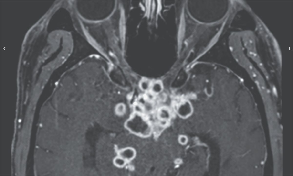 A 29-year-old man presented to the emergency department with a 1-week history of headache and blurry vision. Six weeks earlier, he had received a diagnosis of gastrointestinal tuberculosis and had begun antituberculosis therapy. Physical examination was notable for nuchal rigidity, papilledema, and a relative afferent pupillary defect on the right side. Ophthalmologic evaluation revealed visual acuity of 20/200 in the left eye and only light perception in the right eye. Magnetic resonance imaging of the head revealed multiple ringlike enhancing lesions near the optic chiasm, optic tracts, and perimesencephalic and suprasellar cisterns (see image). Cerebrospinal fluid analysis showed lymphocytic pleocytosis, and nucleic acid amplification testing identified Mycobacterium tuberculosis. A diagnosis of tuberculous optochiasmatic arachnoiditis was made. Tuberculous optochiasmatic arachnoiditis is a complication of tuberculous meningitis in which exudates cause inflammation of the arachnoid of the optic nerve and chiasm, which can result in vision loss. In this patient, the development of this condition was thought to be a paradoxical reaction to antituberculosis therapy that resulted in the development of new lesions. Treatment with dexamethasone was initiated, and the antituberculosis therapy was continued. At a 3-month follow-up visit, the patient’s symptoms had abated.