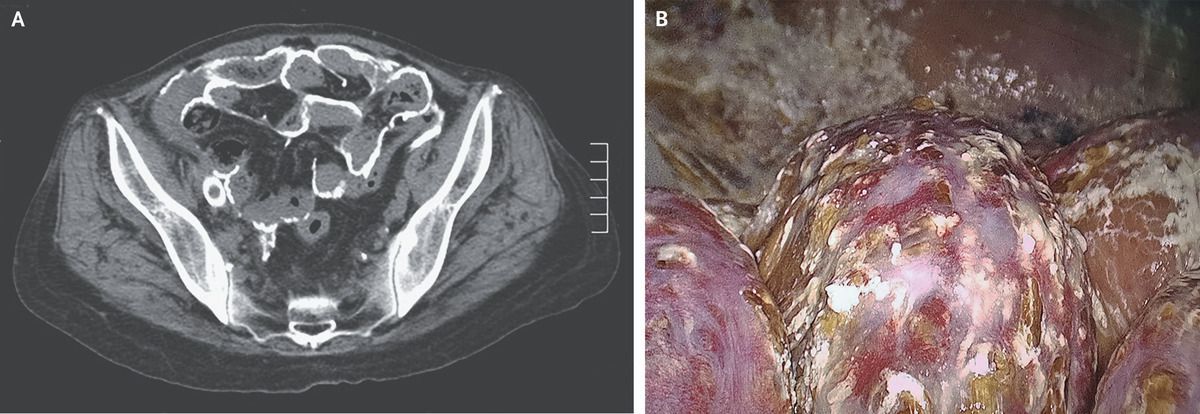 A 52-year-old woman with end-stage kidney disease that was being managed with peritoneal dialysis presented to the nephrology clinic with a 1-month history of bloody dialysate. During her 12 years of undergoing peritoneal dialysis, she had had three episodes of bacterial peritonitis. At the current presentation, she reported no fever or gastrointestinal symptoms. The physical examination was unremarkable. Laboratory studies, including assessments of serum calcium and intact parathyroid hormone levels, were also unremarkable. Computed tomography of the abdomen showed extensive calcification along the visceral and parietal peritoneum (Panel A). Owing to concern for encapsulating peritoneal sclerosis, exploratory laparoscopy was performed to confirm the diagnosis. A markedly thickened parietal peritoneum covered in chalklike deposits was seen (Panel B). Adhesions between the peritoneum and inflamed intestinal serosa were also noted. Histopathological examination showed fibrosis and calcification of the parietal peritoneum, and a final diagnosis of encapsulating peritoneal sclerosis with extensive calcifications was made. Encapsulating peritoneal sclerosis, a rare complication of peritoneal dialysis, involves progressive peritoneal fibrosis. In late stages, the bowel loops may become encased, leading to obstruction. The patient’s peritoneal catheter was removed, and maintenance hemodialysis was initiated. Six months later, she had a partial small-bowel obstruction that resolved with conservative management.