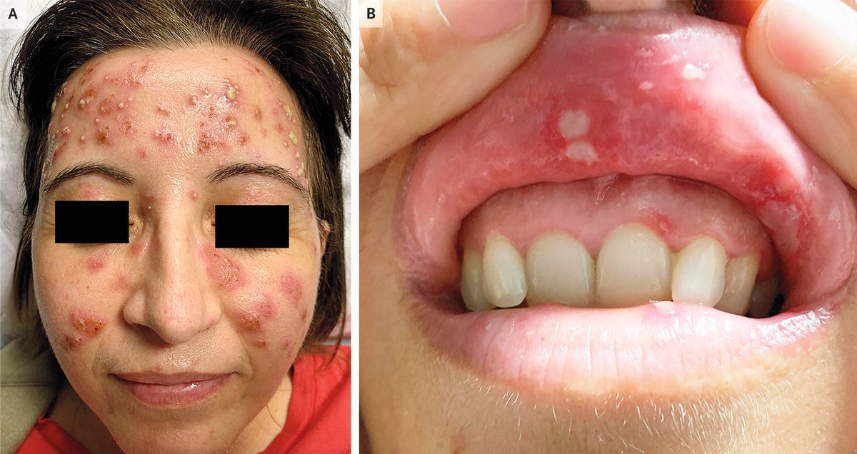 A 44-year-old woman presented to the emergency department with a 1-week history of a pustular rash. The rash had initially appeared on her face and subsequently appeared on her lower legs. She also reported ankle pain and odynophagia. Further history revealed that she had had recurrent bouts of oral ulcers over the past few years. She had never had genital ulcerations. On physical examination, a papulopustular rash was noted on the patient’s face (Panel A) and lower legs. Aphthous ulcers were also seen on the inner lips and gingiva when the patient lifted her lip (Panel B). There was no uveitis or retinal vasculitis on ophthalmologic evaluation. Antinuclear antibody, antineutrophil cytoplasmic antibody, human immunodeficiency virus, syphilis, herpes simplex virus, and pregnancy tests were negative. A pathergy test was not performed. Skin biopsy of a pustular lesion on the right calf revealed focal small-vessel vasculitis. A diagnosis of probable Behçet’s disease was made according to the international criteria for Behçet’s disease. The skin manifestations of Behçet’s disease are varied and include erythema nodosum, pseudofolliculitis, acneiform nodules, and papulopustular lesions, as seen in this patient. Treatment with glucocorticoids and colchicine was initiated. At 2 months of follow-up, the rash had abated.