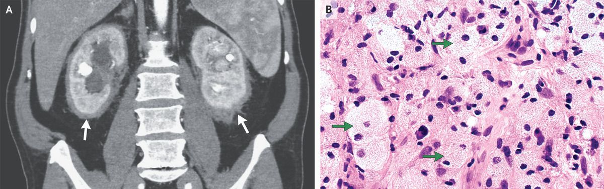 A 62-year-old man undergoing abdominal ultrasonography for the evaluation of gallstones was found to have a retroperitoneal mass. A physical examination and the results of routine laboratory studies, including tests of renal function, were normal. A computed tomographic (CT) urogram showed soft-tissue infiltration of the kidneys (Panel A, arrows), severe hydronephrosis of both kidneys, and moderate splenomegaly. Subsequent positron-emission tomography–CT showed no hypermetabolic activity. Stents were placed in both ureters, and a core-biopsy specimen of the perinephric soft tissue was obtained. Histopathological examination of the specimen revealed diffuse infiltration with pale-staining histiocytes (Panel B, arrows; hematoxylin and eosin staining) admixed with scattered lymphocytes and plasma cells. Immunostaining showed that the cells were strongly positive for CD68 and negative for S100 and CD1a. Molecular testing detected a BRAF V600E mutation. A diagnosis of Erdheim–Chester disease was made. Erdheim–Chester disease is a non–Langerhans-cell histiocytosis that is typically manifested by sclerotic lesions in the long bones — a feature that this patient uniquely did not have. This disease is also associated with numerous extraosseous findings, including infiltration of the retroperitoneal perinephric tissue, which results in a “hairy kidney” appearance on cross-sectional imaging, as was seen in this patient. Treatment with vemurafenib, a targeted inhibitor of the mutated BRAF V600E kinase, was started. At a 1-year follow-up visit, the patient had had no disease progression.