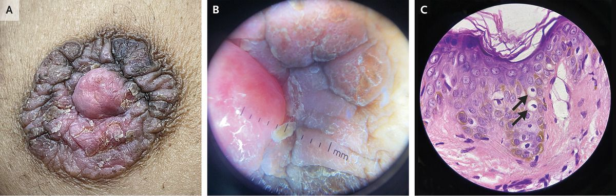 A 44-year-old woman presented to the clinic dermatology with a 1-year history of an itchy skin lesion on the right nipple and intermittent nipple discharge. On physical examination, there was a well-demarcated, dark-pink plaque over the entire nipple–areola complex on the right side. The lesion had a raised, irregular margin, as well as overlying crusting and excoriation (Panel A). Dermoscopy of the lesion showed superficial furrows and scaling (Panel B). There was no palpable breast mass or axillary lymphadenopathy. A punch biopsy of the lesion revealed malignant, intraepithelial adenocarcinoma cells — also known as Paget cells (Panel C, arrows; hematoxylin and eosin staining). A diagnosis of Paget’s disease of the breast was made. Paget’s disease of the breast is an uncommon manifestation of breast cancer that develops in the skin of the nipple. It is usually associated with underlying ductal carcinoma in situ or invasive ductal carcinoma. Diagnosis may be challenging because the lesion often resembles benign conditions, such as eczema. Magnetic resonance imaging of the right breast showed ductal carcinoma in situ in the areola. Treatment with nipple–areola resection and wide local excision followed by radiotherapy was completed. At 1 year of follow-up, there was no evidence of recurrence.