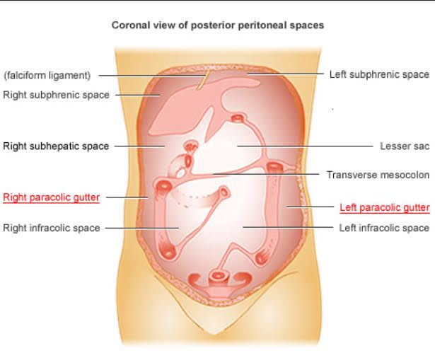Paracolic Gutter lie on the lateral and the medial sides of the ascending and descending colon respectively. They provide channels for the movement of infected fluid in the peritoneal cavity. Subphrenic Spaces lie between the diaphragm and the liver and they are called the right and left, anterior and posterior Subphrenic Spaces. Clinically, these spaces are important because they may provide sites for the accumulation of pus
