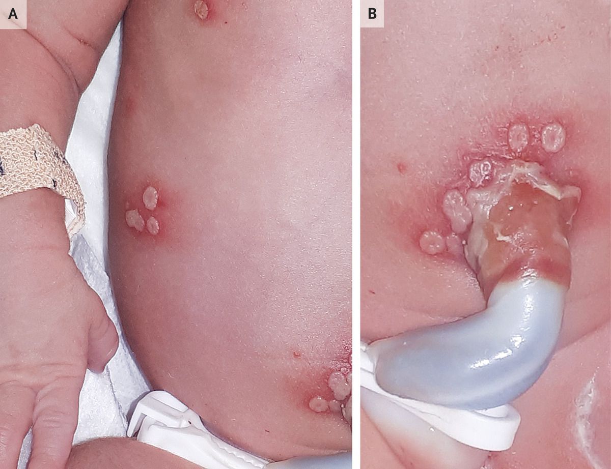 A baby girl was noted to have vesicular skin lesions immediately after spontaneous vaginal delivery at 32 weeks’ gestation. Her 37-year-old mother had premature rupture of membranes 12 days before the delivery. On physical examination, clusters of vesicles were seen on the infant’s torso (Panel A), periumbilical region (Panel B), and pharyngeal, nasal, and conjunctival mucosa. No lesions were seen on the mother’s genitals or the placenta. Polymerase-chain-reaction (PCR) testing of samples obtained from the infant’s skin, conjunctivae, pharynx, and blood were positive for herpes simplex virus type 1 (HSV-1). The results of chest radiography, lumbar puncture, and liver biochemical tests were normal. A diagnosis of neonatal HSV-1 infection that was confined to the skin, eyes, and mucosa was made. The mother reported no history of previous HSV-1 infection. However, a postpartum endocervical PCR assay was positive for HSV-1. In this case, a primary maternal infection late in pregnancy was thought to have led to ascending intrauterine infection and possibly preterm labor after prolonged rupture of membranes. Treatment with acyclovir was given. At 2 years of age, the child had had no recurrences and was developmentally normal.