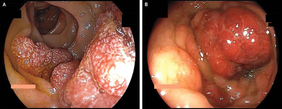 A 54-year-old man with no known medical history presented to the emergency department with a 10-day history of bloody diarrhea and a 3-month history of progressive, red skin lesions. Physical examination revealed cachexia; erythematous papules on the face, torso, and legs; edema of the legs and feet; purplish nodules in the posterior oropharynx; and a distended abdomen. Results of laboratory studies were notable for a positive test for human immunodeficiency virus, a CD4 count of 45 cells per cubic millimeter (reference range, 300 to 1400), and a viral load of 5.5 million copies per millimeter. Computed tomography of the whole body showed a pleural effusion on the right side, pericardial effusion, ascites, diffuse lymphadenopathy, and diffuse thickening of the bowel wall. An upper endoscopy and colonoscopy were performed. Erythematous, polypoid lesions were seen throughout the gastrointestinal tract, from the esophagus to the rectum (Panel A, duodenum; Panel B, sigmoid colon). Biopsy specimens from multiple lesions showed features consistent with Kaposi’s sarcoma. A diagnosis of Kaposi’s sarcoma with cutaneous and gastrointestinal involvement was made. During a prolonged hospital course, the patient also received a diagnosis of cytomegalovirus colitis, and coronavirus disease 2019–related pneumonia. The patient died on hospital day 32.