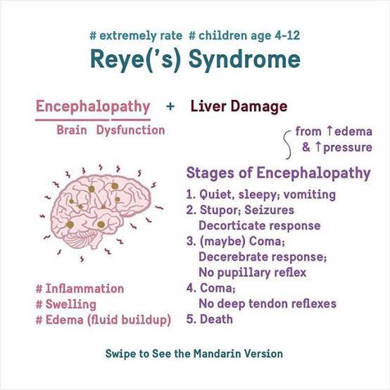 Reye's syndrome (RS) is rare disorder that affects all organs of the body but is most harmful to the brain and the liver—causing an acute increase of pressure within the brain and, often, massive accumulations of fat in the liver and other organs. RS is defined as a two-phase illness because it generally occurs during recovery from a viral infection, such as the flu or chicken pox. It also can develop three to five days after the onset of the viral illness. RS is primarily a children's disease, although it can occur at any age. It is often misdiagnosed. Symptoms may include: Persistent or recurrent vomiting Listlessness Personality changes such as irritability or combativeness Disorientation or confusion Delirium Convulsions Loss of consciousness The cause of RS is unknown. Studies have shown a link between aspirin (salicylate) and the onset of Reye's syndrome. Because of this association, healthcare professionals do not recommend the use of aspirin for children. There is no cure for RS. Treatment focuses on preventing brain damage. Recovery is directly related to the severity of the swelling of the brain. Some individuals recover completely, while others may sustain varying degrees of brain damage.
