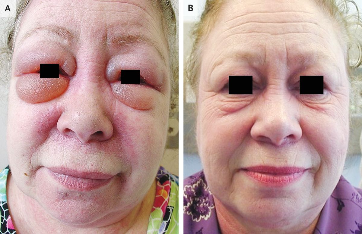 A 61-year-old woman presented to the rheumatology clinic with a 6-month history of periorbital swelling and shoulder weakness. She reported no dyspnea, cough, or joint pain. The physical examination was notable for erythema of the upper and lower eyelids and substantial periorbital edema (Panel A). There was also midfacial erythema involving the nasolabial folds, poikiloderma of the upper back, and 4/5 strength of the shoulder abductors on both sides. Laboratory testing showed a creatine kinase level of 6300 U per liter (reference range, 24 to 170), an antinuclear antibody titer of 1:320, and positivity for anti-p155/140 myositis autoantibody. Magnetic resonance imaging of the right deltoid muscle showed muscle edema. A skin biopsy showed interface dermatitis. A diagnosis of dermatomyositis was made. Dermatomyositis is an idiopathic inflammatory myopathy characterized by immune-mediated muscle and skin injury. As in this case, the pathognomic skin finding of a periorbital heliotrope rash may be accompanied by eyelid edema in dermatomyositis. Other typical skin findings in this patient included shawl sign and a malar rash that did not spare the nasolabial folds. Treatment with oral glucocorticoids, methotrexate, and intravenous immune globulin was initiated. Screening for cancer was negative. At the 2-month follow-up, the patient’s weakness, rashes, and periorbital edema had abated (Panel B).