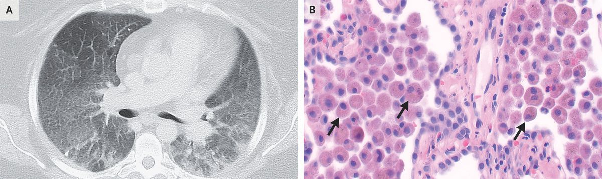 A 34-year-old woman with tobacco use disorder, severe obesity, and chronic hypoxemic respiratory failure of unknown cause was referred to the pulmonary clinic for worsening dyspnea and dry cough. She reported no history of environmental or occupational exposures, substance use, or fevers. Her oxygen saturation was 93% while she was receiving 3 liters of supplemental oxygen. On physical examination, breath sounds were quiet but vesicular. There was no clubbing of the fingers. Pulmonary-function tests showed mild restriction and a mild reduction in diffusing capacity. Computed tomography of the chest showed diffuse ground-glass opacities and areas of peripheral consolidation but no basilar reticulations or honeycombing (Panel A). The results of testing for autoantibodies and hypersensitivity pneumonitis were negative, and bronchoalveolar lavage was not diagnostic, so surgical lung biopsy was performed. The histopathological analysis showed interstitial fibrosis and extensive alveolar filling with pigment-laden macrophages on hematoxylin and eosin staining (Panel B, arrows). These findings were consistent with a diagnosis of desquamative interstitial pneumonia, a rare form of idiopathic interstitial pneumonia that is highly associated with cigarette smoking. A lung biopsy is necessary to make the diagnosis. Treatment with a smoking-cessation program and a tapering dose of glucocorticoids was initiated. At the 3-month follow-up, the patient’s symptoms remained unchanged as she continued to engage in smoking cessation.
