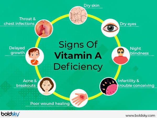 Vitamin A is a fat-soluble vitamin essential in cell development, metabolism, immune competency, vision, and reproductive functions.Vitamin A deficiency (VAD) is a highly prevalent health concern associated with substantial morbidity and mortality, mostly affecting young children in impoverished regions throughout the world. Insufficient intake of absorption leads to deficiency and compromise of essential physiologic processes. Natural sources of vitamin A include dark leafy greens, orange-colored vegetables, milk products, liver, and fish.It is absorbed in the duodenum after hydrolyzation by pancreatic and intestinal enzymes and emulsified with dietary fats and bile acids.The majority is then stored in the hepatic stellate cells.Significant amounts are also stored in adipose tissue and the pancreas. The recommended dietary allowance (RDA) of vitamin A by the Institute of Medicine in healthy adults is 700 micrograms/day for women and 900 micrograms/day for men.For children, pregnant women, and lactating women, the RDA is 300 to 900, 770, and 1300 micrograms/day respectively. The minimum requirement to prevent symptomatic VAD in children 1 to 5 years of age is about 200 micrograms/day. Serum retinol levels are a good marker of vitamin A nutritional status. Deficiency is defined as a retinol concentration of fewer than 20 micrograms/dL. Vitamin A deficiency-associated ocular symptoms have been shown to develop at concentrations less than 10 micrograms/dL.Dietary vitamin A is ingested as either carotenoid from fruits and vegetables or retinoid from animal products. Carotenoids are a provitamin A, most commonly beta-carotene, and retinoids are active forms of vitamin A, such as retinol and retinyl esters. Retinoids have been shown to have 75% to 100% absorption, whereas carotenoid absorption varies greatly depending on the food matrix and type of carotenoid. A 12 to 1 ratio of beta-carotene to retinol absorption in a diet of mixed fruits and vegetables is the estimated conversion used by the Centers for Disease Control and Prevention. Many populations in developing countries rarely ingest meat, dairy, or carotenoid-rich vegetables leading to difficulty obtaining sufficient quantities of vitamin A.
