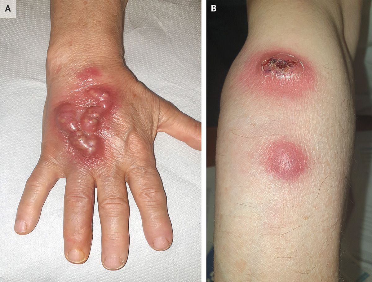 A 75-year-old woman presented to the infectious diseases clinic with a 10-day history of painful lesions on the right hand and forearm. The nodules had first appeared on the back of her hand at the site of a thorn puncture she had sustained while gardening. The lesions had spread up the hand along a red streak and then had appeared on the forearm. Physical examination was notable for a serpentine array of firm, tender nodules on the dorsum of the right hand with overlying erythema but no drainage (Panel A). On the dorsal side of the right forearm, there were two tender, erythematous nodules, with overlying ulceration of the more proximal one (Panel B). Lymphadenopathy was noted in the right axilla. An aspiration of the hand lesion was performed. Bacterial culture of the aspirate grew filamentous, gram-positive, acid-fast branching rods that were subsequently identified as Nocardia brasiliensis. A diagnosis of sporotrichoid nodular lymphangitis was made. Nodular lymphangitis occurs when infectious subcutaneous nodules spread proximally from the site of inoculation along lymphatic channels. The syndrome occurs in sporotrichosis but also in similar-appearing sporotrichoid infections with nocardia species, Mycobacterium marinum, and Leishmania braziliensis. After a course of trimethoprim–sulfamethoxazole, the lesions resolved.