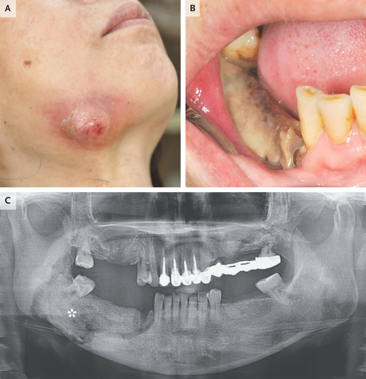 A 54-year-old woman with metastatic breast cancer presented to the oral surgery clinic with a 4-month history of right jaw pain. For the past 10 months, she had been receiving denosumab at a dose of 120 mg every 4 weeks to prevent complications related to bony metastases. Physical examination was notable for swelling over the right jaw from an oral cutaneous fistula that connected to the mandible (Panel A). An area of exposed, necrotic bone was seen inside the mouth in an edentulous region of the right mandible (Panel B). She had several missing teeth and periodontitis. A panoramic radiograph showed an ill-defined radiolucent border with sequestrum over the right mandible (asterisk, Panel C). A diagnosis of medication-related osteonecrosis of the jaw complicated by secondary infection with extraoral fistula formation was made. Medication-related osteonecrosis of the jaw is an uncommon but severe complication of treatment with osteoclast inhibitors, such as denosumab and bisphosphonates. Risk factors include oral surgery, poor oral hygiene, and dental disease. It does not commonly occur with the use of antiresorptive medications at lower doses for conditions such as osteoporosis. The patient underwent surgical débridement and sequestrectomy, during which time treatment with denosumab was discontinued, and antimicrobials and oral rinses were administered. Denosumab therapy was resumed, and at the 1-year follow-up, her symptoms had resolved.