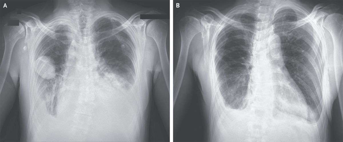 A 50-year-old man with a history of mitral-valve prolapse and of Hodgkin’s lymphoma 20 years earlier that was treated with chemotherapy and radiation therapy presented to the emergency department with a 5-day history of dyspnea. Physical examination showed jugular venous distention, diminished breath sounds at the lung bases, and a holosystolic murmur at the cardiac apex. A radiograph of the chest showed indistinct pulmonary vascularity, a dense retrocardiac opacity, and pleural effusions on both sides. A sharply demarcated, lenticular lesion was shown in the right middle lung field (Panel A, anterior–posterior view). An echocardiogram showed an ejection fraction of 45% and severe mitral regurgitation. Treatment with diuretics and vasodilators was initiated. A follow-up chest radiograph 3 days after presentation showed complete resolution of the right lung opacity, as well as reduced pulmonary edema (Panel B, posterior–anterior view). A diagnosis of phantom tumor of the lung was made. Phantom tumors of the lung, also known as vanishing tumors or pseudotumors, are loculated interlobar pleural effusions that occur most commonly in the minor fissure, as in this case. The resolution of phantom tumors with diuresis distinguishes them from true masses. Surgical coronary-artery revascularization and mitral-valve replacement were performed. At 1-month follow-up, the patient was doing well.