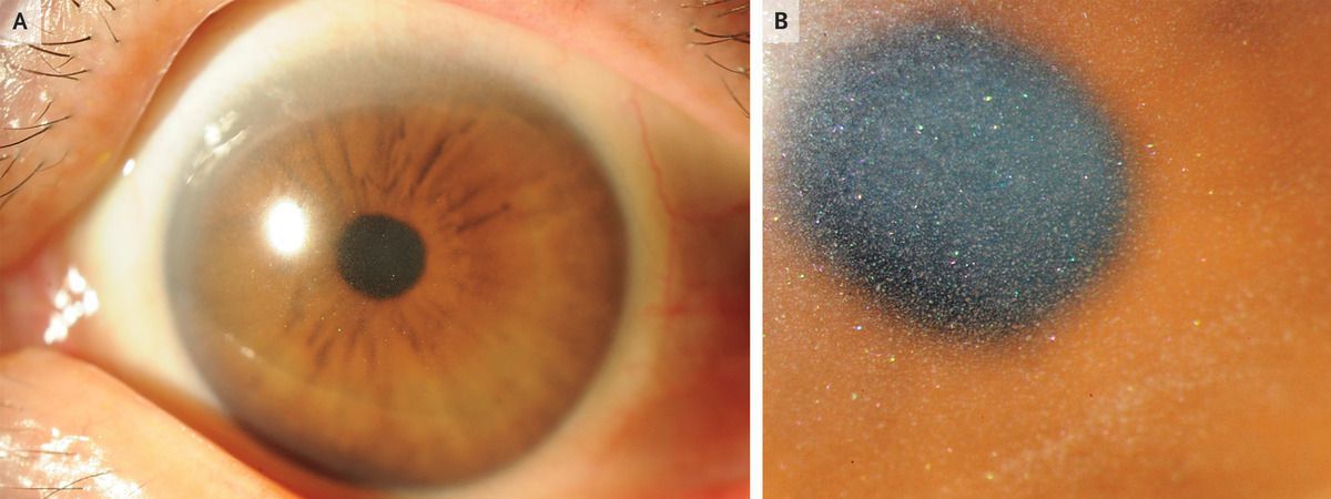 A 66-year-old woman presented to the eye hospital with a 6-month history of photophobia and blurry vision. On physical examination, the visual acuity was 20/25 in the right eye and 20/30 in the left eye. Diffuse corneal clouding by crystalline deposits with multicolored reflectivity was seen in the corneal stroma of both eyes on slit-lamp examination (Panels A and B). The rest of the eye examination was normal. Corneal crystalline deposits may occur in the context of primary ophthalmologic conditions, such as ocular infections or corneal dystrophy, or in the context of systemic diseases, such as cystinosis or paraproteinemias. Owing to concern for an underlying systemic condition, laboratory testing was performed, which showed a new normocytic anemia. The patient was subsequently referred to a hematologist for further evaluation, and IgG kappa multiple myeloma was ultimately diagnosed. A final ophthalmologic diagnosis of corneal immunoglobulin deposition due to multiple myeloma was made. The patient was treated with chemotherapy and autologous hematopoietic stem-cell transplantation. At follow-up 1 year after the transplantation, the corneal clouding had resolved and the patient’s vision had returned to normal.