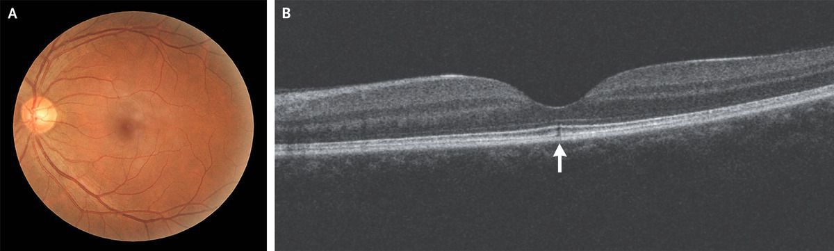 A previously healthy 43-year-old man from Western Australia presented to the ophthalmology clinic with a 3-week history of blurry vision. He reported no eye pain or scotomas but did report a years-long practice of watching sunsets without eye protection. Visual acuity was 20/30 in the right eye and 20/50 in the left eye. A funduscopic examination in both eyes was normal (Panel A, left eye), as was the rest of the evaluation, including slit-lamp examination. Optical coherence tomography (OCT) of the left macula revealed a discontinuity in the inner and outer foveal photoreceptor segments and retinal pigment epithelium interdigitation zone (Panel B, arrow). OCT of the right macula was normal. A diagnosis of solar retinopathy was made. Solar retinopathy is a type of retinal photochemical injury caused by ultraviolet radiation. Causes include solar eclipse viewing, arc welder or laser pointer exposure, or direct sun gazing, as in this case. Although visual recovery can occur over a period of months, metamorphopsia (shape misperception) or central scotoma may be permanent in some cases. The patient was advised to wear eye protection against ultraviolet radiation and to avoid direct sun gazing. Unfortunately, the patient was lost to follow-up.