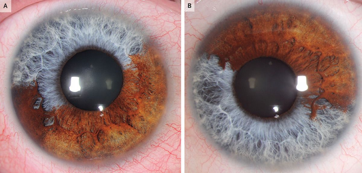 A 43-year-old man presented to the ophthalmology clinic with a 3-month history of redness of the eyelids and was found to have multicolored irises. He reported that his irises had appeared this way since birth. On ophthalmologic examination, the visual acuity was 20/25 in each eye. The iris of the right eye had a blue superior sector and a brown inferior sector (Panel A), and the iris of the left eye had an inverse color pattern (Panel B). A chalazion was present on the left upper eyelid. The remainder of the examination was normal. A diagnosis of congenital sectoral heterochromia was made. Heterochromia is a difference in color between a person’s two irises. Heterochromia can be complete (meaning that each iris is a single color that is different from the other) or sectoral (meaning that each iris consists of more than one color). Congenital heterochromia may be an isolated, benign finding or may be associated with an inherited syndrome. In this case, the patient had a family history of heterochromia and deafness in several first-degree family members, although he reported having no hearing problems. Referrals for audiometry and genetic testing were made owing to concern about a possible genetic condition. Warm compresses were recommended for the management of the chalazion.