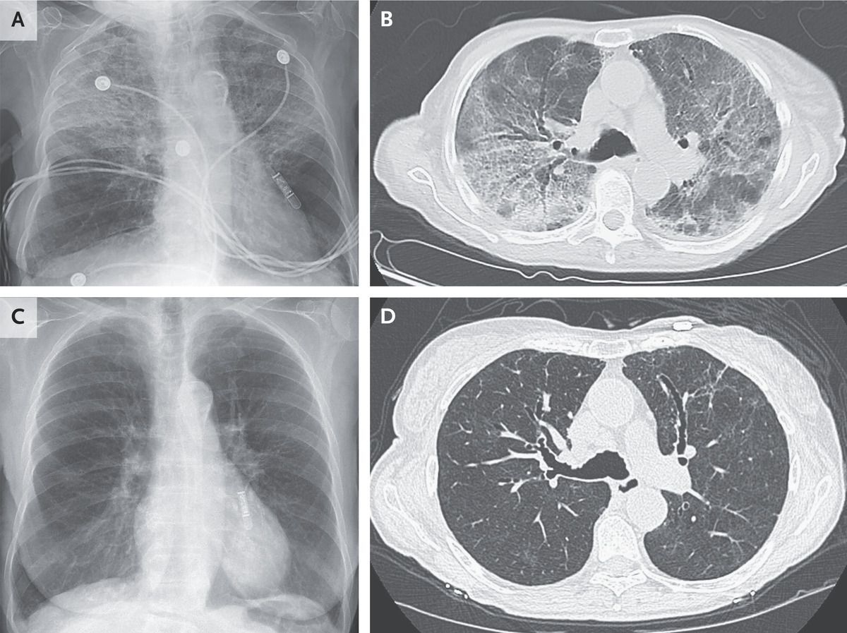 A 95-year-old woman presented to the emergency department with a 4-week history of dyspnea and dry cough. She had not previously reported these symptoms to her doctor. She reported no fevers. For the past 6 months, she had been taking nitrofurantoin daily to prevent recurrent urinary tract infections. Her oxygen saturation was 83% while she was breathing ambient air. On physical examination, inspiratory crackles were noted in the upper lung fields. There was no jugular venous distention or edema. Laboratory studies showed neutrophilic leukocytosis but no eosinophilia or elevations in aminotransferase levels. A chest radiograph was notable for patchy alveolar opacities that were most prominent in the upper lobes (Panel A). A sputum culture and viral respiratory panel were negative. A subsequent computed tomographic image of the chest showed ground-glass and reticular opacities with upper-lobe predominance and moderate bronchiectasis (Panel B). Owing to the patient’s imaging findings and long-term nitrofurantoin exposure, a diagnosis of chronic nitrofurantoin-induced lung injury was made. In patients with nitrofurantoin-induced lung injury, the radiologic findings are varied and may be diffusely distributed or localized. Treatment with nitrofurantoin was stopped, and a prednisone taper was prescribed. One week later, the patient’s symptoms had abated. Two months later, repeat imaging showed that the opacities had nearly resolved and the bronchiectasis had stabilized (Panels C and D, respectively).