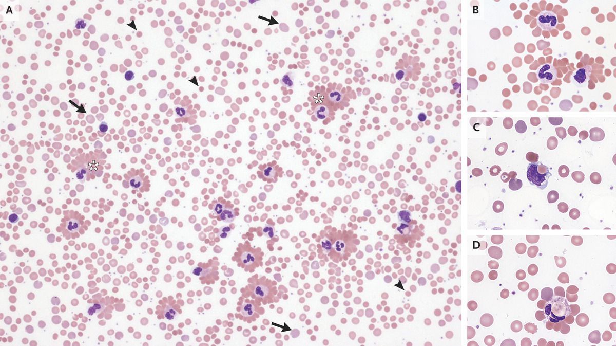 A 3-year-old girl presented to the emergency department with a 1-day history of dark urine and jaundice after the development of an upper respiratory tract infection 1 week earlier. The physical examination was notable for pharyngeal erythema and exudates, conjunctival pallor, and scleral icterus. There was no hepatosplenomegaly, rash, or acrocyanosis. Laboratory studies showed a new anemia and findings consistent with hemolysis. A subsequent peripheral-blood smear (Panel A) showed varied sizes and shapes of red cells that included reticulocytes (arrows) and spherocytes (arrrowheads), as well as erythrocyte agglutination (asterisks). Many neutrophils were coated with agglutinated erythrocytes, forming rosettes (Panel B). Phagocytosis of erythrocytes in macrophages (Panel C) and neutrophils (Panel D) was also seen — rare findings in autoimmune hemolytic anemia. A direct antiglobulin test was positive for C3d and weakly positive for IgG. The cold agglutinin titer was 1:1024. Tests for Mycoplasma pneumoniae, Epstein–Barr virus, and other common respiratory viruses were negative. A diagnosis of autoimmune hemolytic anemia from cold agglutinin syndrome associated with an upper respiratory infection was made. Supportive care, including blood transfusions and cold avoidance, was provided. At the 3-week follow-up, the child felt well and the anemia had abated.