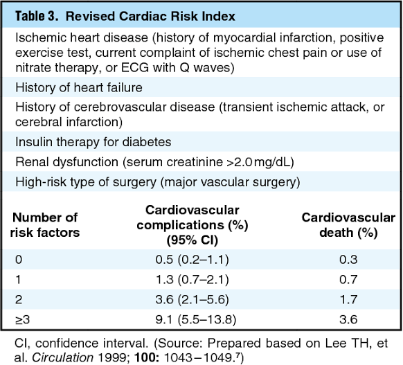 Lee's Revised Cardiac Risk Index is used for the cardiovascular assessment in the patient undergoing the surgery. Patients with more than 3 risk factors have a greater chance of cardiovascular complication and cardiovascular death.