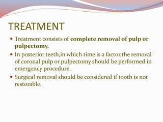 In irreversible pulpitis, the pulpitis and its sequelae require endodontic (root canal) therapy or tooth extraction. In endodontic therapy, an opening is made in the tooth and the pulp is removed. The root canal system is thoroughly debrided, shaped, and then filled with gutta-percha.