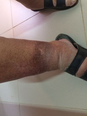 Its normal of leg swelling after surgery but max upto 8 weeks .. but here it seems from last 7 years so its not normal at all .. i think its bcz of compressing of vessels or due to thrombus in vein so his distal limb cant get enough blood supply and its reason behind swelling and mucosis of nail ...